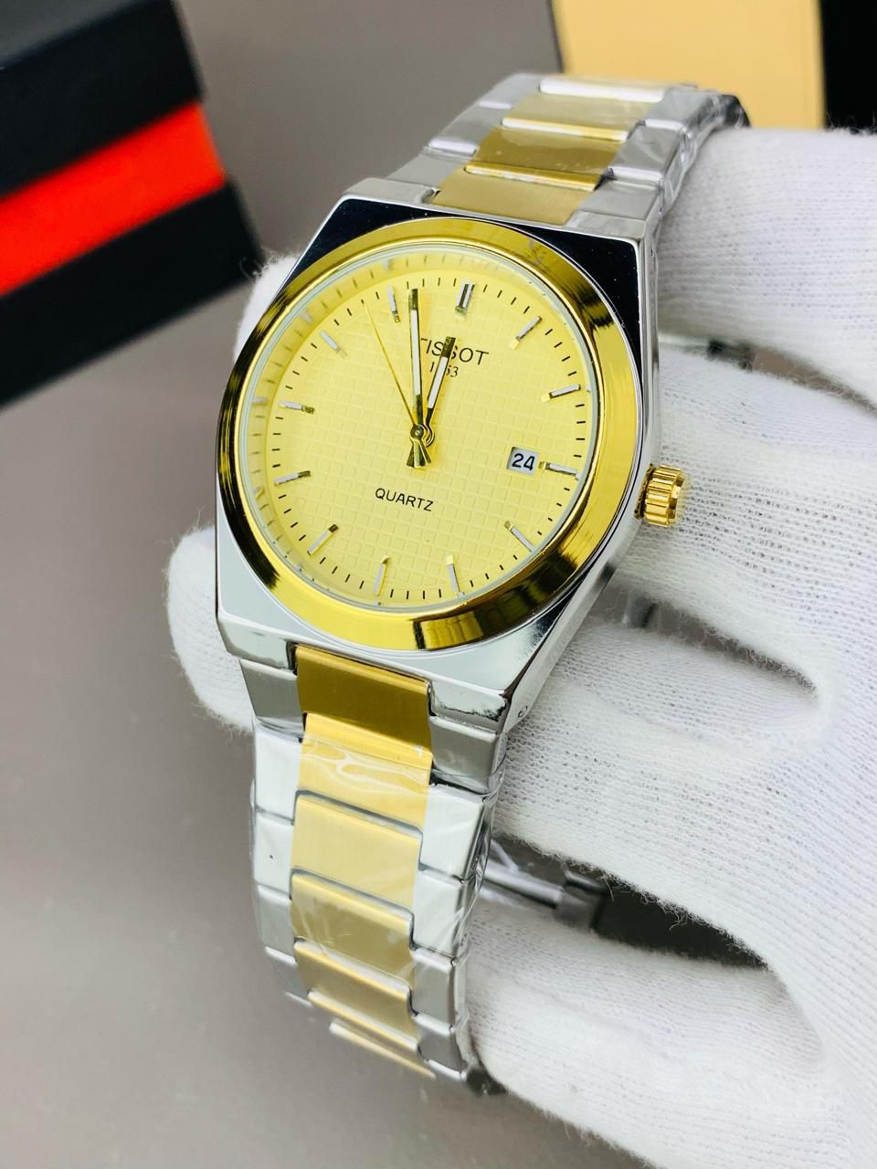 This two-tone watch features a radiant gold dial, complemented by a sophisticated silver and gold chain strap. The dial is designed with clean, minimalist markers and a convenient date window at 3 o’clock, blending both elegance and functionality. The silver and gold combination in the case and chain strap adds a luxurious touch, making this timepiece suitable for both formal occasions and everyday wear.
